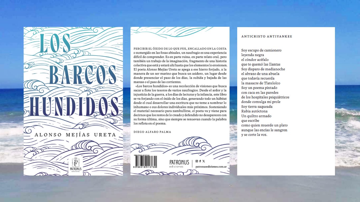 Percibir el óxido de lo que fue, encallado en la costa o sumergido en las fosas abisales, un naufragio es una experiencia difícil de comprender. Es en parte ruina, en parte relato oral, pero también un trabajo de la imaginación, fragmento de una historia colectiva que está y estará ahí hasta que los elementos lo erosionen. El poeta Alonso Mejías Ureta se apega a ese hierro forjado, a la manera de un ser marino que busca un asidero, un lugar desde donde presenciar el paso de los días, la subida y bajada de las mareas o el paso de las corrientes.